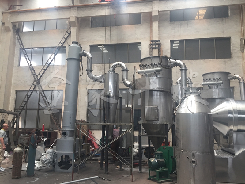 hot air tangent enters the bottom of the dryer and is driven by a stirrer to create a powerful rotating wind field. The paste material enters into the dryer through the screw feeder. Under the strong action of the high-speed rotating paddle, the material is dispersed under the action of impact, friction and shear force. The bulk material is quickly crushed and fully contacted with hot air and heated. ,dry. The dehydrated dry material rises with the hot gas flow. The grading ring retains large particles. The small particles exit the dryer from the center of the ring and are recovered by the cyclone separator and the dust collector. It is not dried or the bulk material is affected by the centrifugal force. And falling back to the bottom was crushed and dried.