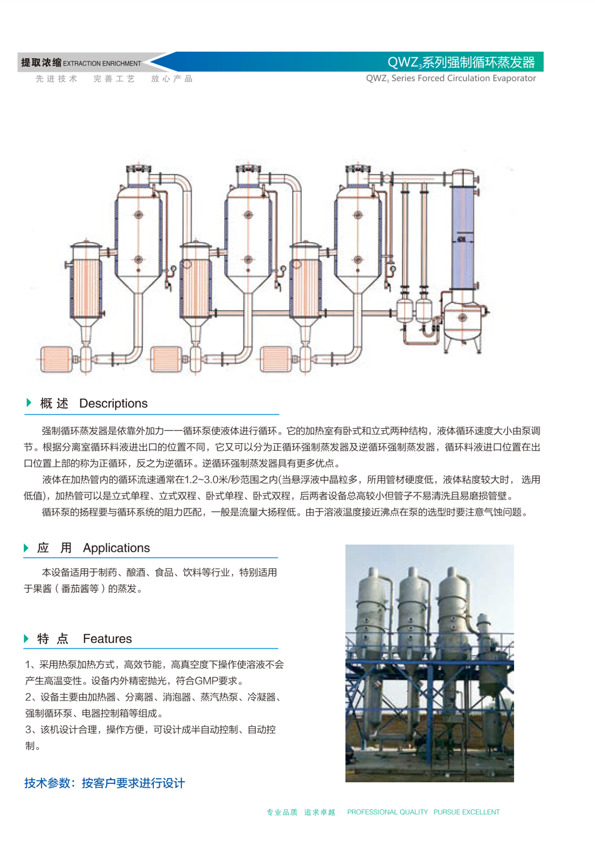簡介: 強制循環蒸發器是依靠外加力--循環泵使液體進行循環。它的加熱室有臥式和立式兩種結構,液體循環速度大小由泵調節。根據分離室循環料液進出口的位置不同,它又可以分為正循環強制蒸發器及逆循環強制蒸發器,循環料液進口位置在出口位置上部的稱為正循環,反之為逆循環。